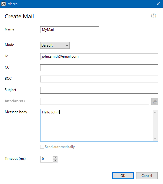 •Timeout (ms) - Specify the delay (in milliseconds) to pause the execution until the mail client is fully loaded.
