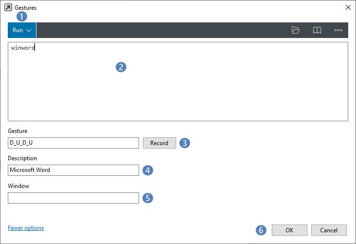 Gesture code (D-down, U-up, L-left, R-right; Additional codes UL, UR, DL, DR are available if 8 zone recognition is active). Press the Record button to record a gesture by moving a mouse anywhere on the screen.