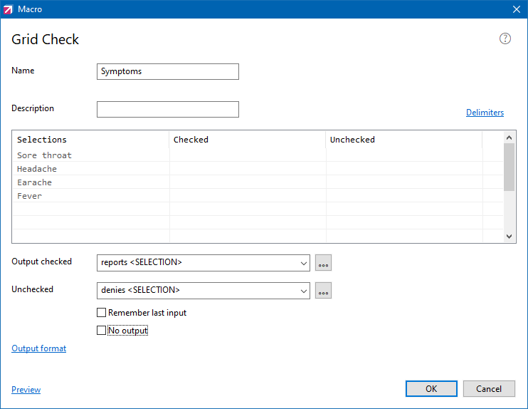 •Output checked - Select the output format to be used when the selection is checked. Any combination of Selection, Field contents and a free text can be defined. Use <Selection> and <Field> placeholders to insert selection contents. Select a down arrow to choose one of the preset formats.