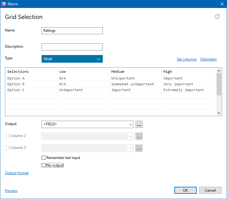 •Output - Select the output format. Any combination of Selection, Column, Field contents and a free text can be defined. Use <Selection>, <Column> and <Field> placeholders to insert selection contents. Select a down arrow to choose one of the preset formats.