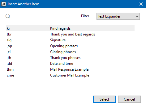 Link and nest phrases by inserting the content of another command into command. This allows reusing the same text or actions in different commands.